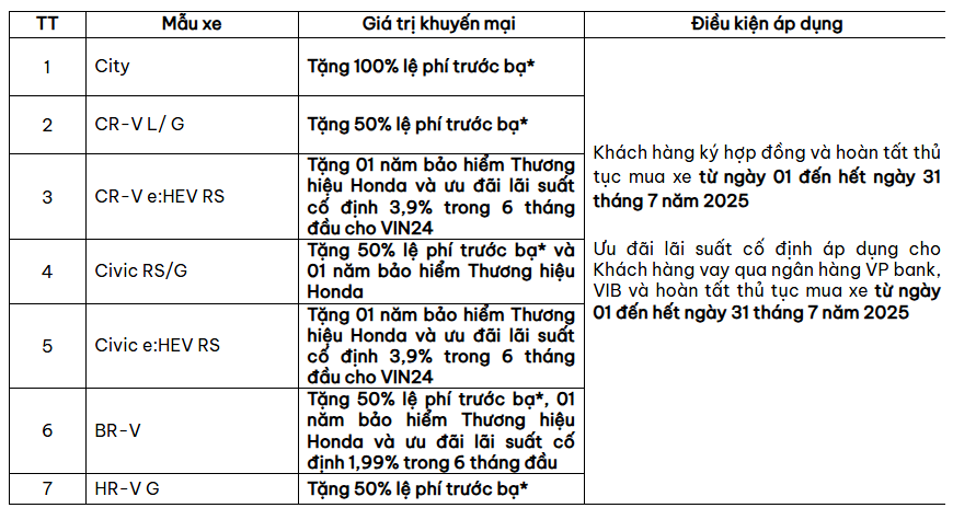 Chương trình khuyến mại của các dòng xe ô tô Honda tháng 7 năm 2025