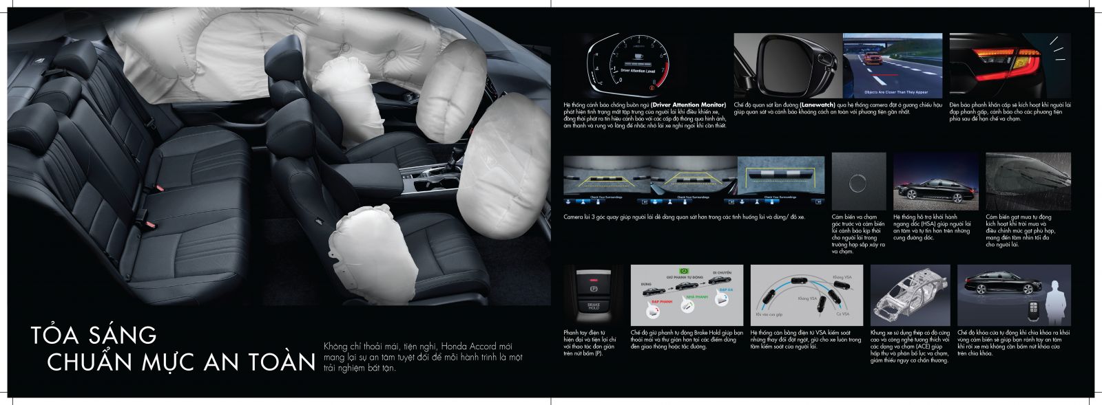 Bên cạnh đó, Honda Accord mới được trang bị các công nghệ an toàn tiên tiến như Hệ thống cảnh báo chống buồn ngủ (Driver Attention Monitor), Hệ thống quan sát làn đường (Honda Lanewatch), Phanh tay điện tử (EPB), Giữ phanh tự động, Cân bằng điện tử (VSA), Hỗ trợ khởi hành ngang dốc (HSA), Camera chiếu hậu đa góc, hệ thống an toàn 6 túi khí,…nhằm hỗ trợ người lái suốt hành trình di chuyển và bảo vệ toàn diện cho tất cả hành khách. Không chỉ thoải mái, tiện nghi, Honda Accord 2022 mới mang lại sự an tâm tuyệt đối bởi hệ thống an toàn được trang bị tiên tiến nhất để mỗi hành trình là một trải nghiệm bất tận.